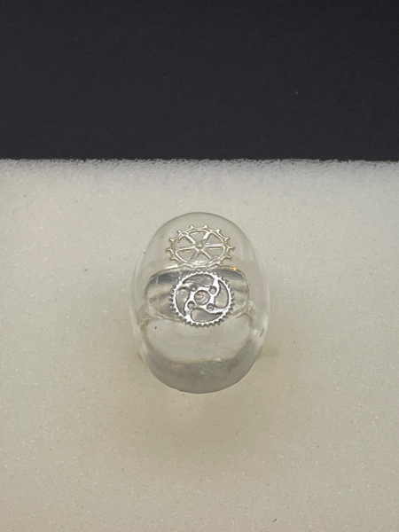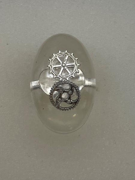 Bague avec engrenages incrustés dans la résine.