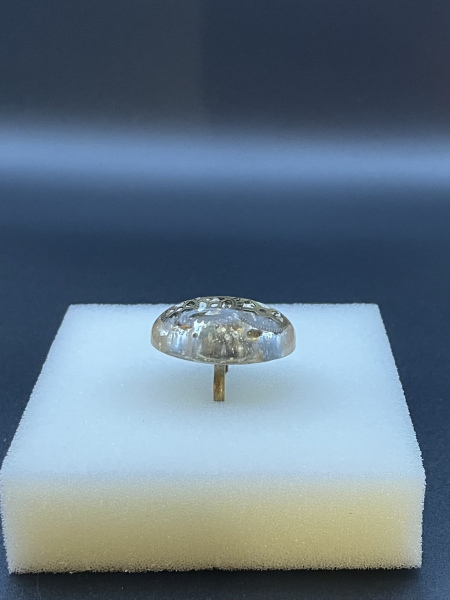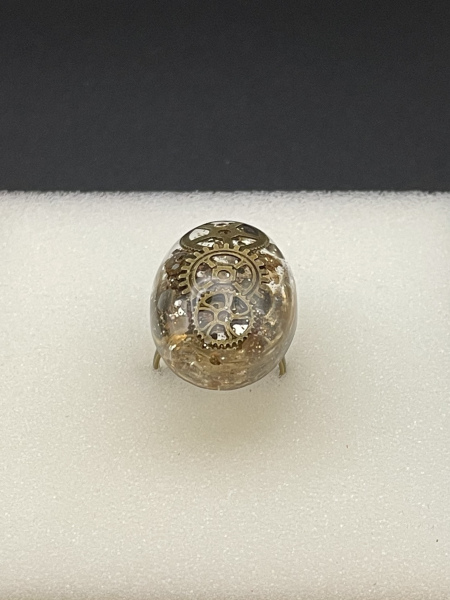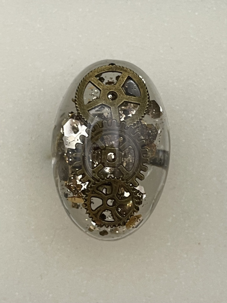 Bague avec engrenages et paillettes incrustés dans la résine.