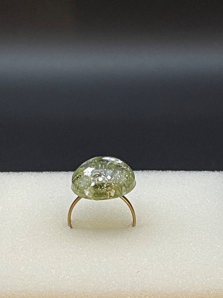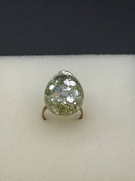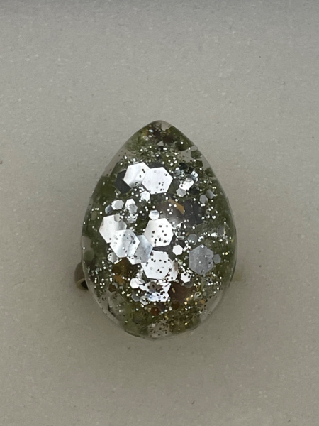 Bague avec paillettes incrustées dans la résine.