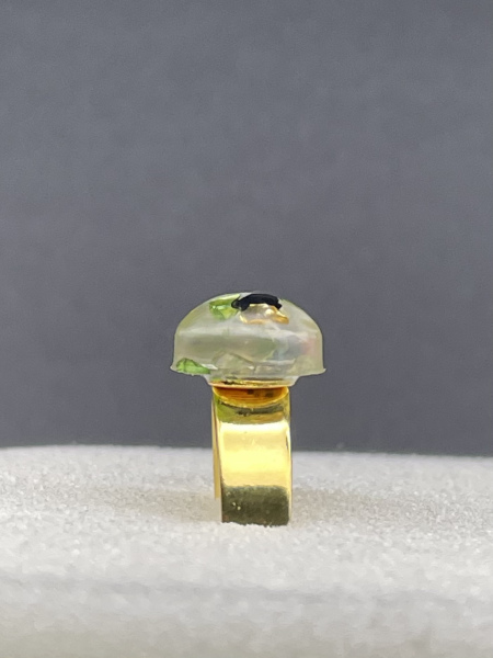 Bague avec pierres de verre concassées incrustées dans la résine et anneau ajustable en acier inoxydable.