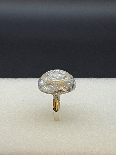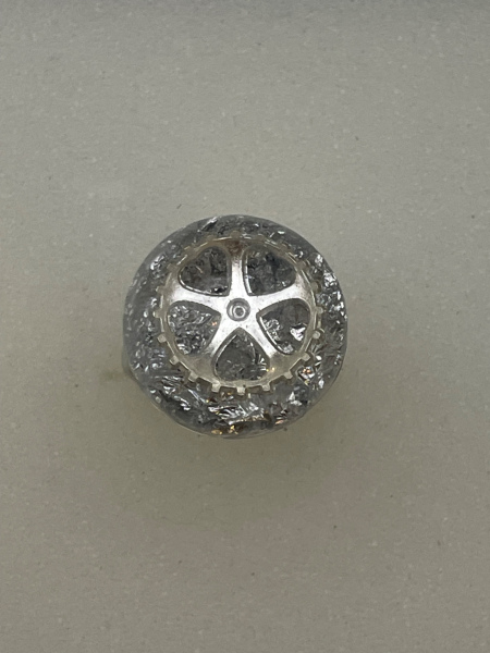 Bague avec engrenage et paillettes incrustés dans la résine.