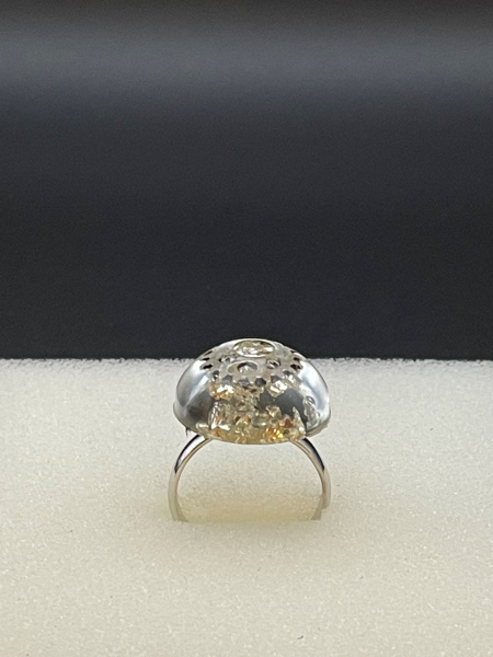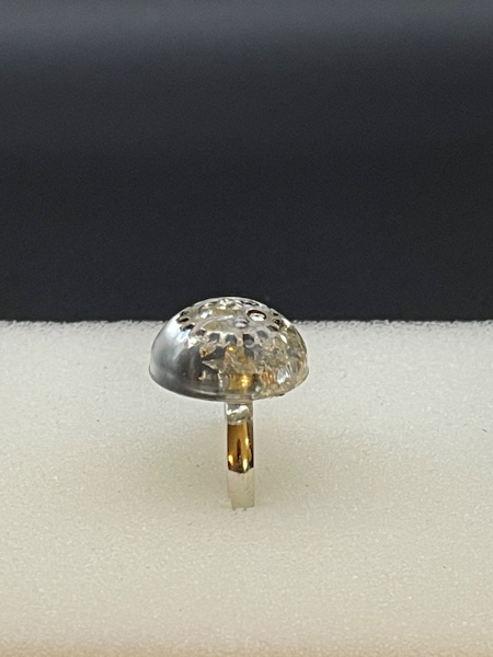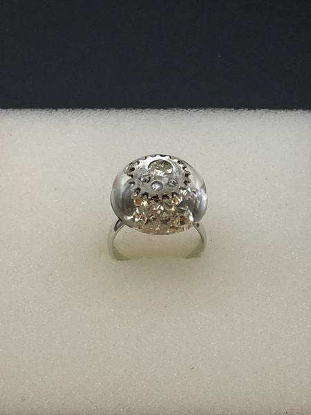 Bague avec engrenage et pierres de verre concassées incrustés dans la résine.