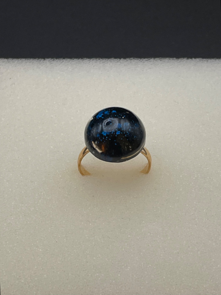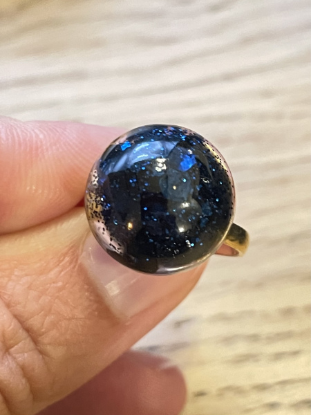 Bague avec paillettes incrustées dans la résine.
