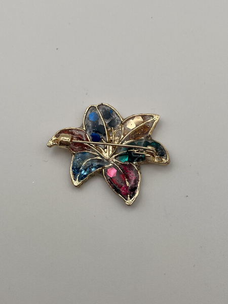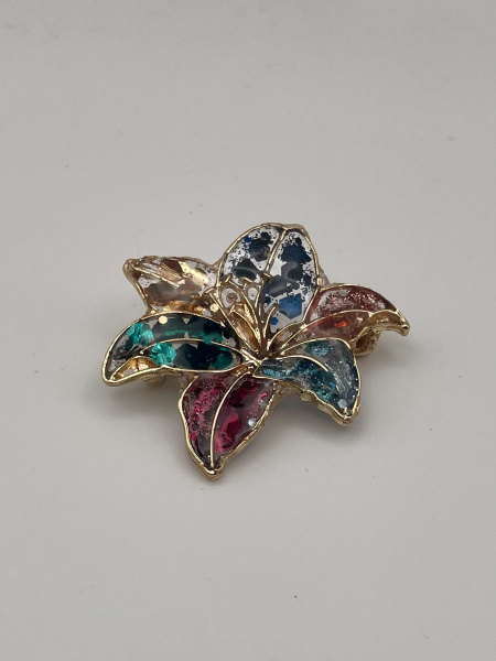 Jolie broche en forme de fleur avec paillettes inscrustées dans la résine.