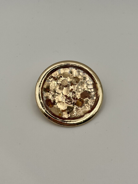 Jolie broche en forme de rond avec paillettes inscrustées dans la résine.
