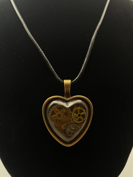 Collier cabochon bronze de forme coeur avec engrenages incrustés dans la résine.