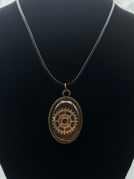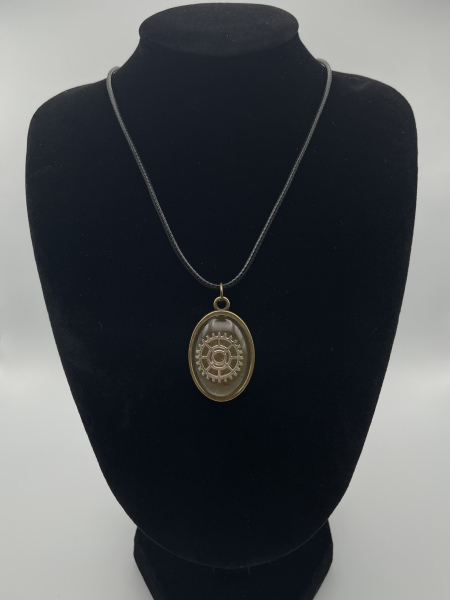 Collier cabochon bronze de forme ovale avec engrenage incrusté dans la résine.