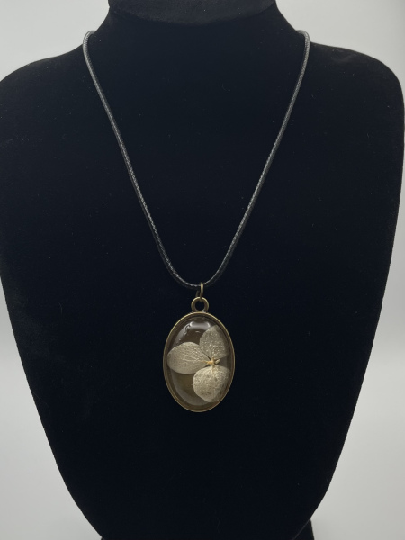 Collier cabochon bronze de forme ovale avec fleur séchée incrustée dans la résine.