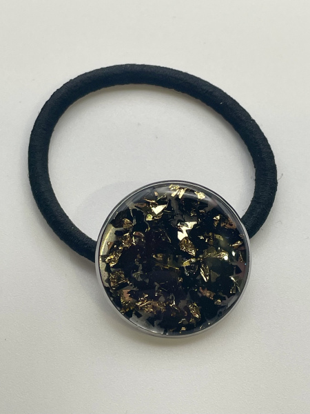 Joli élastique cabochon avec feuilles métalisées or et noires incrustées dans la résine.