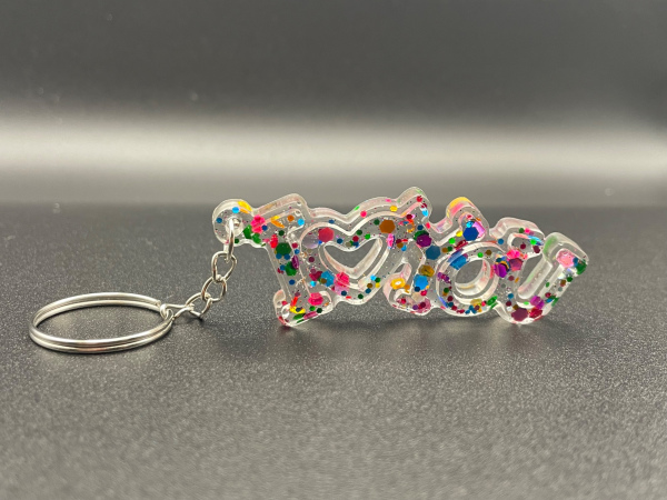 Porte-clef I Love You avec paillettes incrustées dans la résine.