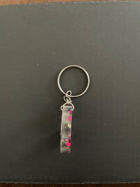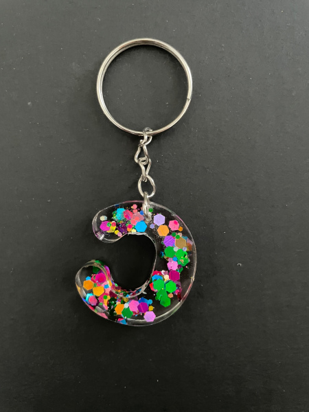 Porte-clef lettre "C" avec paillettes incrustées dans la résine.