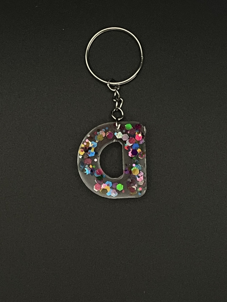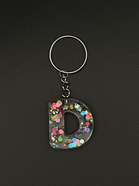 Porte-clef lettre "D" avec paillettes incrustées dans la résine.