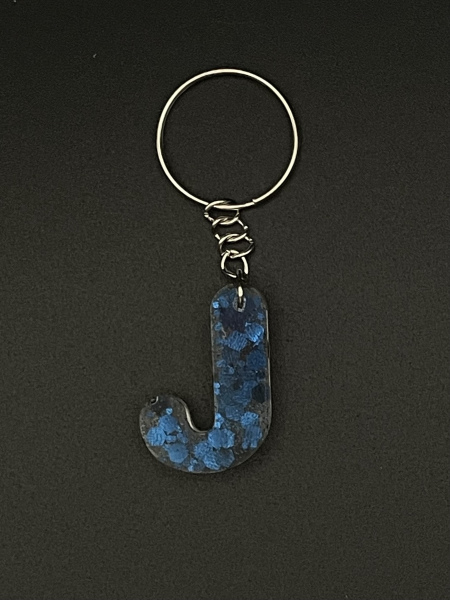 Porte-clef lettre "J" avec paillettes incrustées dans la résine.