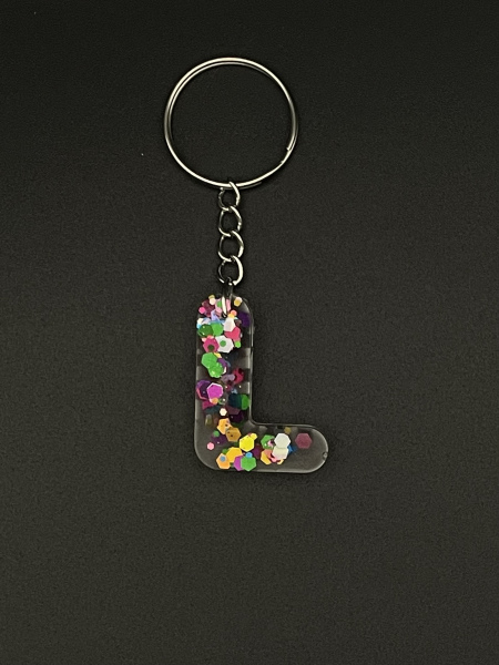 Porte-clef lettre "L" avec paillettes incrustées dans la résine.