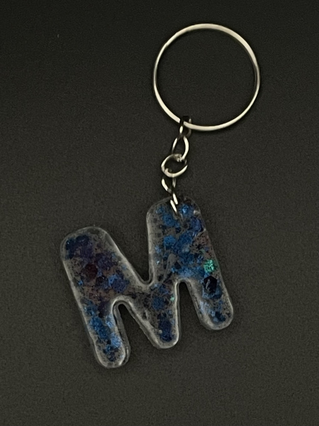 Porte-clef lettre "M" avec paillettes incrustées dans la résine.