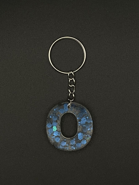 Porte-clef lettre "O" avec paillettes incrustées dans la résine.