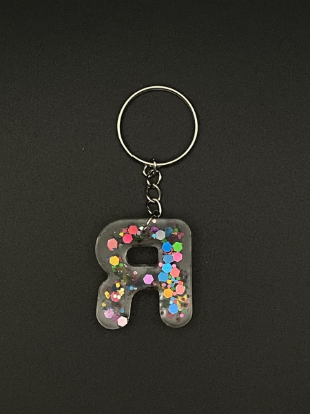 Porte-clef lettre "R" avec paillettes incrustées dans la résine.