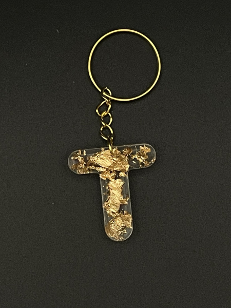 Porte-clef lettre "T" avec feuilles métalisées dorées incrustées dans la résine.