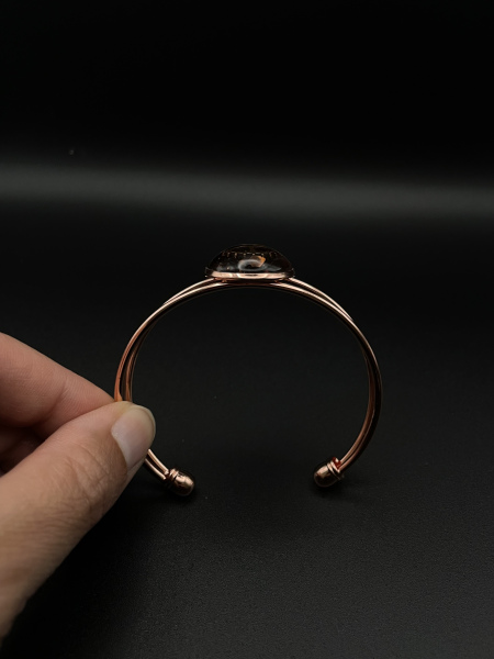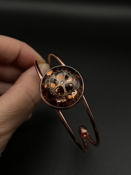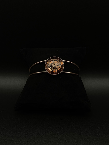 Bracelet jonc cabochon engrenage et paillettes bronze et marrons