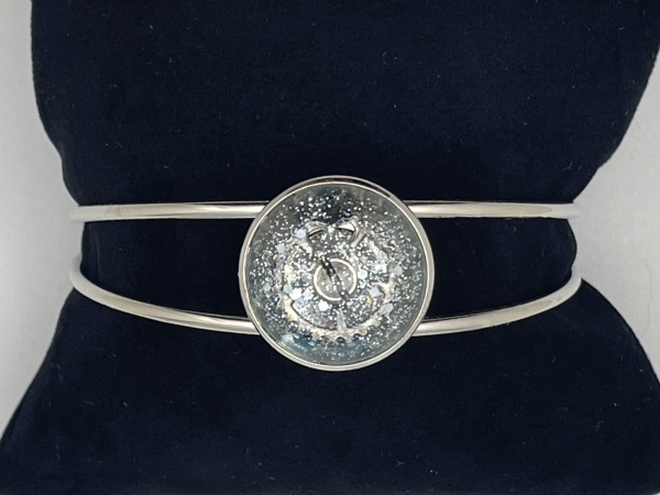 Bracelet jonc de largeur ajustable. Paillettes et engrenage incrustés dans la résine.
