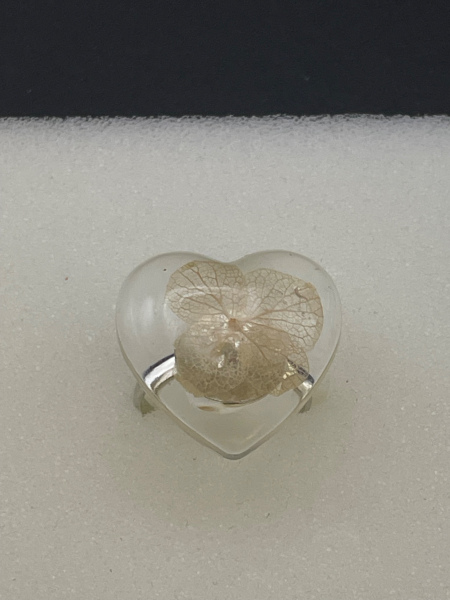 Bague avec fleur séchée incrustée dans la résine.