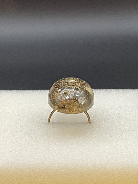 Bague avec engrenages et paillettes incrustés dans la résine.