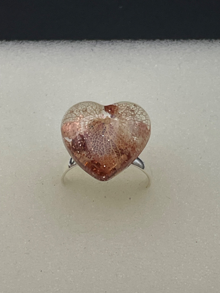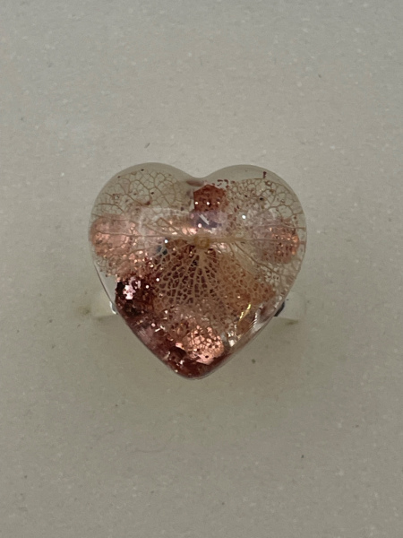 Bague avec fleur séchée incrustée dans la résine.