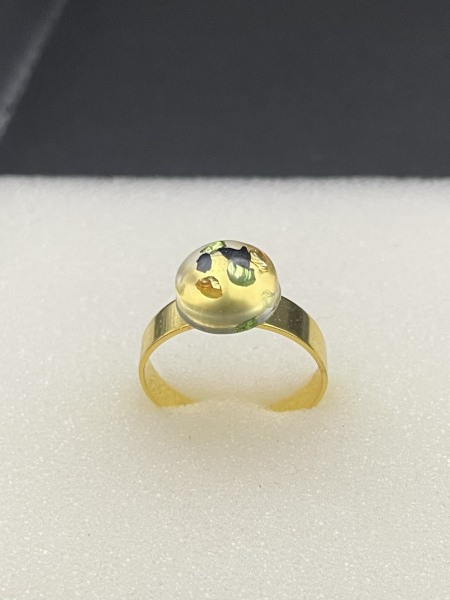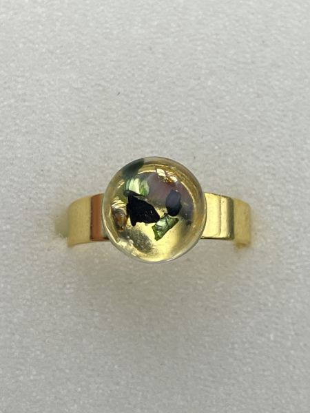 Bague avec pierres de verre concassées incrustées dans la résine et anneau ajustable en acier inoxydable.