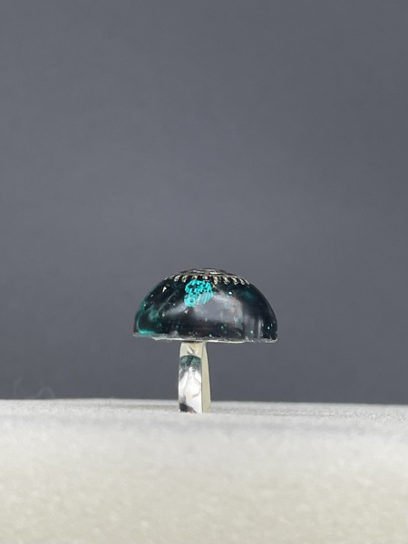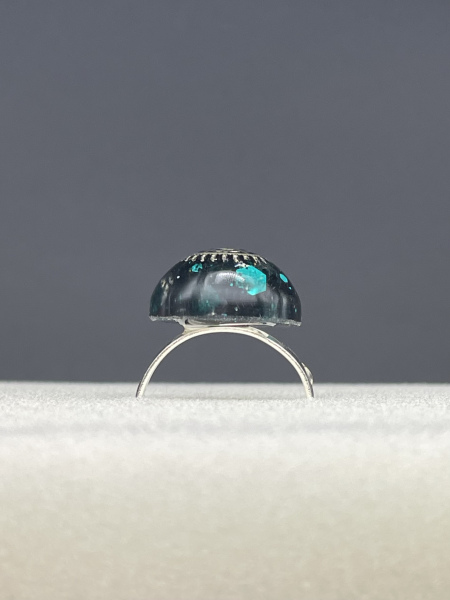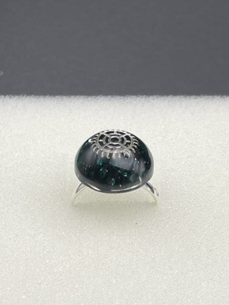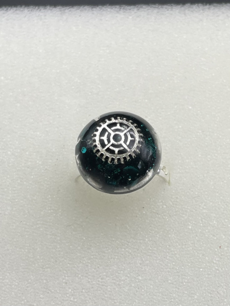 Bague avec engrenage et paillettes incrustés dans la résine.