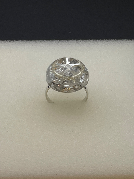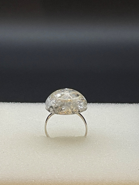 Bague avec engrenage et paillettes incrustés dans la résine.