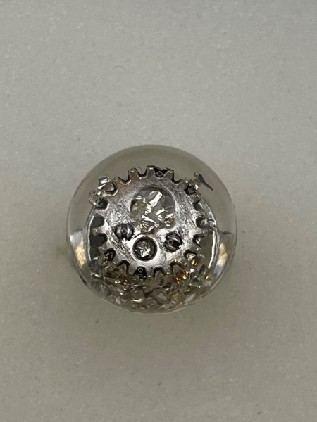 Bague avec engrenage et pierres de verre concassées incrustés dans la résine.