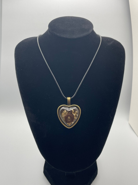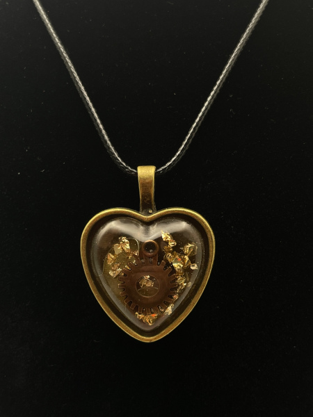 Collier cabochon bronze de forme coeur avec pierres de verre concassées dorées et écrou bronze incrustés.