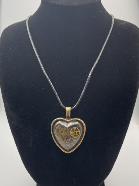 Collier cabochon bronze de forme coeur avec engrenages incrustés dans la résine.
