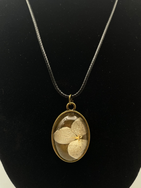 Collier cabochon bronze de forme ovale avec fleur séchée incrustée dans la résine.