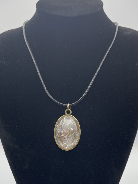 Collier cabochon bronze de forme ovale avec paillettes incrustées dans la résine.