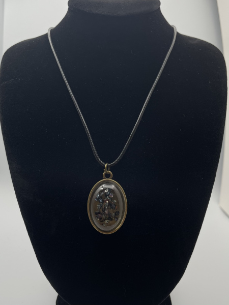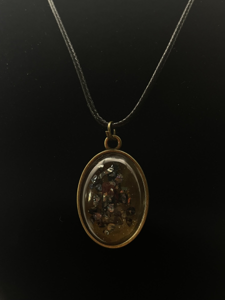 Collier cabochon bronze de forme ovale avec pierres de verre concassées incrustées dans la résine.