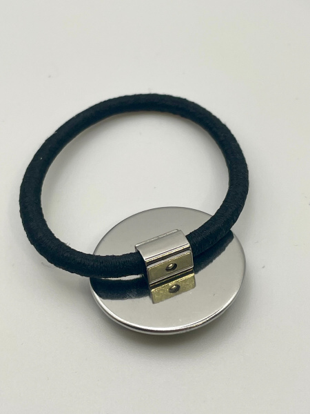 Joli élastique cabochon avec feuilles métalisées or et noires incrustées dans la résine.