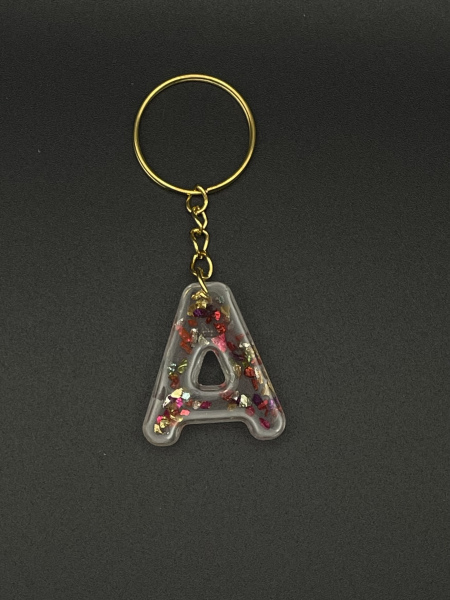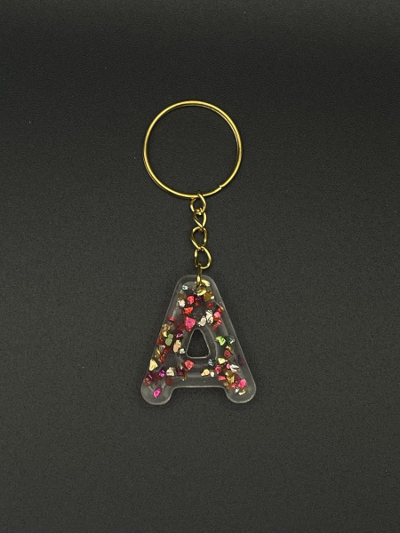Porte-clef lettre "A" avec pierres de verre concassées incrustées dans la résine.