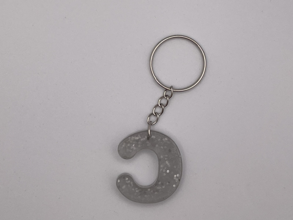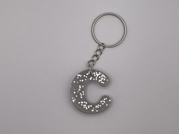 Porte-clef lettre "C" avec paillettes incrustées dans la résine.