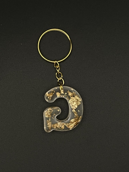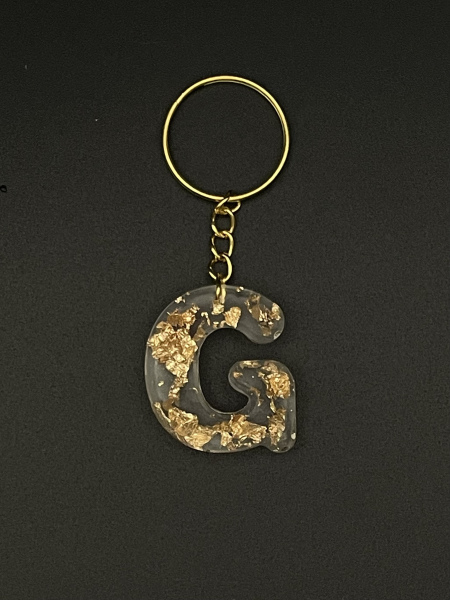 Porte-clef lettre "G" avec feuilles métalisées dorées incrustées dans la résine.