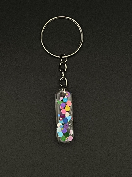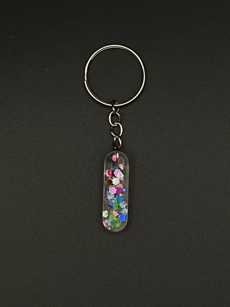 Porte-clef lettre "I" avec paillettes incrustées dans la résine.