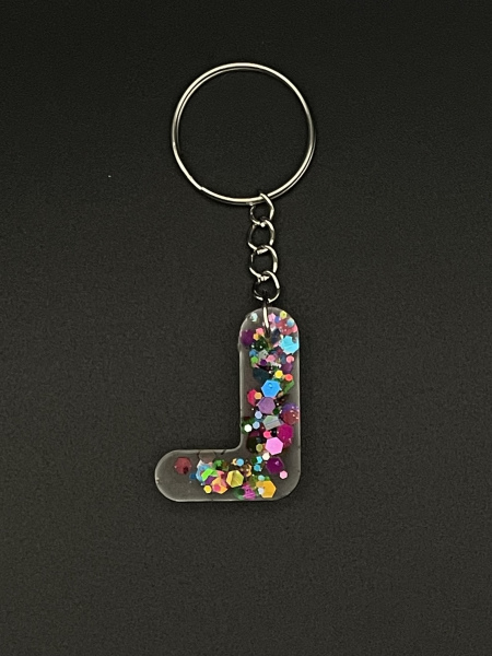 Porte-clef lettre "L" avec paillettes incrustées dans la résine.