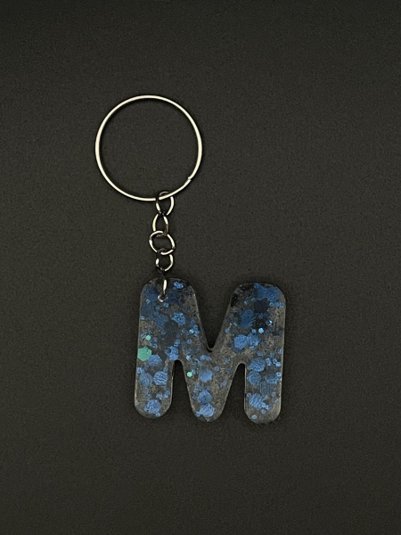 Porte-clef lettre "M" avec paillettes incrustées dans la résine.