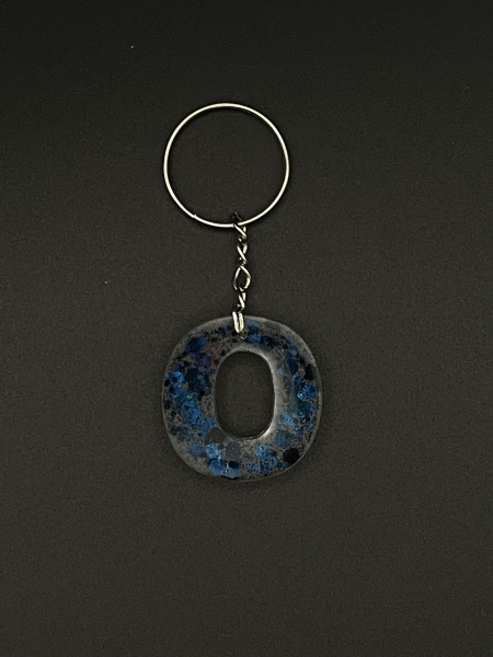 Porte-clef lettre "O" avec paillettes incrustées dans la résine.