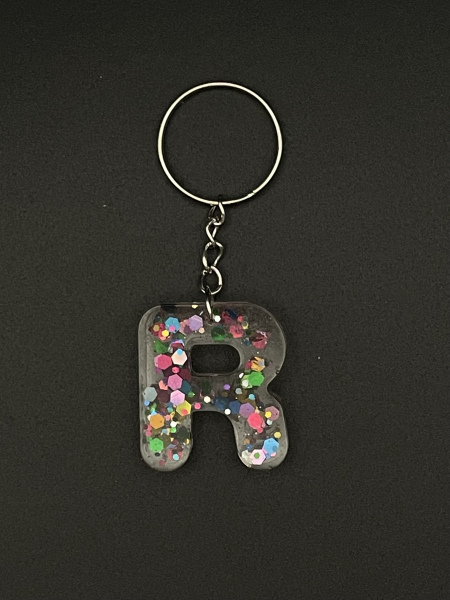 Porte-clef lettre "R" avec paillettes incrustées dans la résine.
