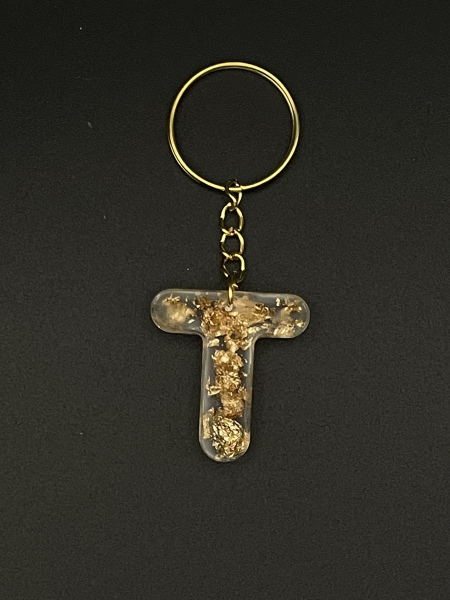 Porte-clef lettre "T" avec feuilles métalisées dorées incrustées dans la résine.