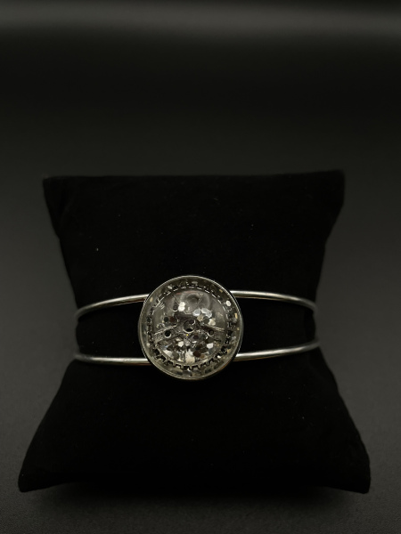 Bracelet jonc de largeur ajustable. Paillettes et engrenage incrustés dans la résine.