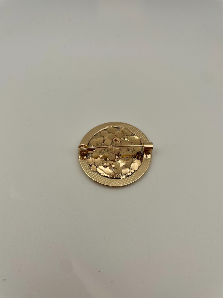 Jolie broche en forme de rond avec paillettes inscrustées dans la résine.