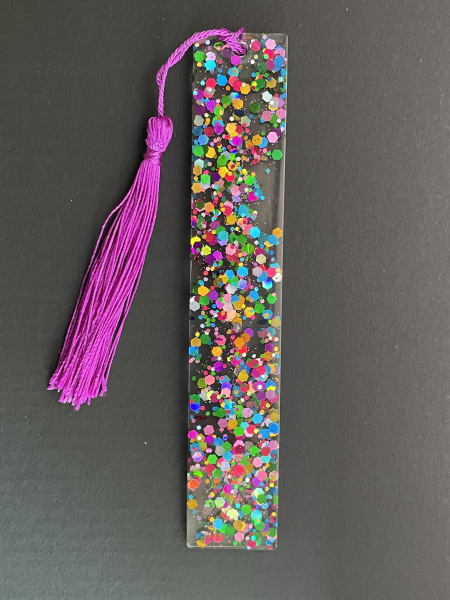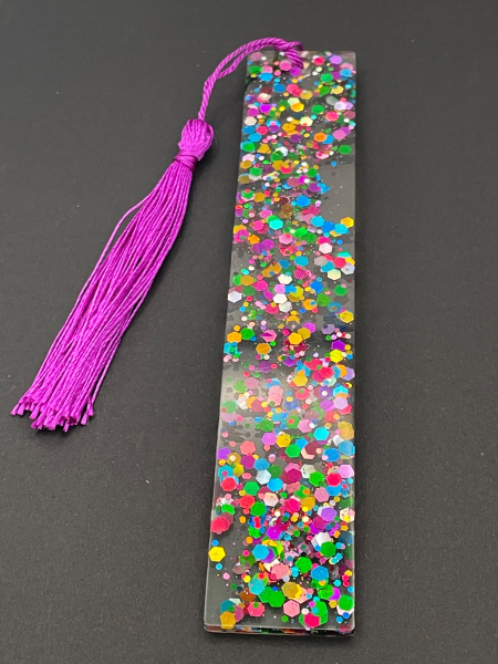 Marque-page avec paillettes incrustées dans la résine et pompon.