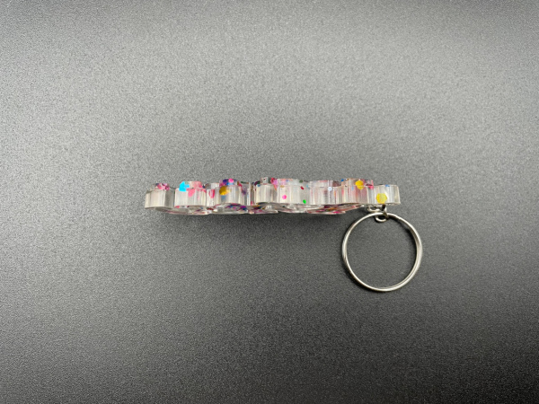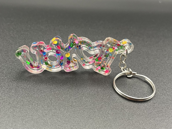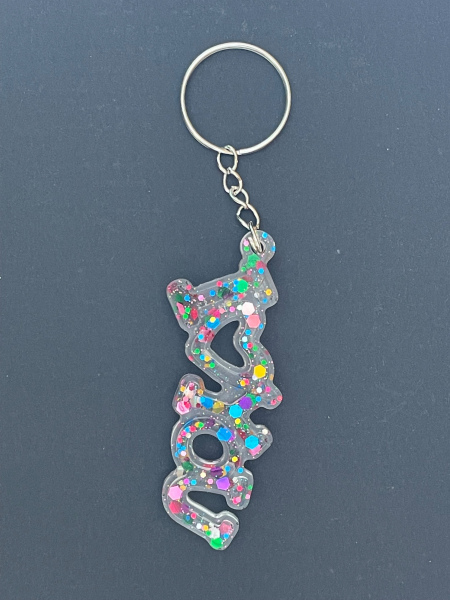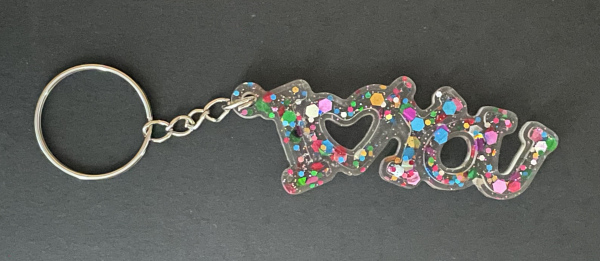 Porte-clef I Love You avec paillettes incrustées dans la résine.